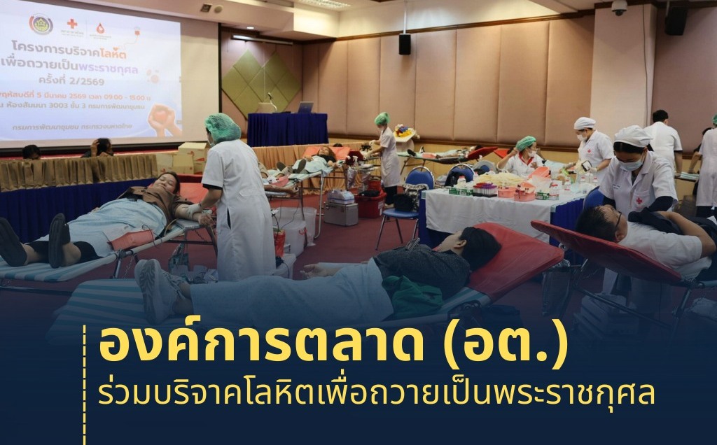 องค์การตลาด (อต.) ร่วมบริจาคโลหิตเพื่อถวายเป็นพระราชกุศล ประจำปีงบประมาณ พ.ศ. 2569 ครั้งที่ 2/2569 เมื่อวันที่ 5 มีนาคม 2569 ณ ห้องสัมมนา 3003 ชั้น 3 กรมการพัฒนาชุมชน ศูนย์ราชการแจ้งวัฒนะ ซึ่งจัดขึ้นโดยกรมการพัฒนาชุมชน ร่วมกับ สภากาชาดไทย เพื่อให้ผู้บริจาคโลหิตได้มีส่วนร่วมในการแสดงความจงรักภักดีและสำนึกในพระมหากรุณาธิคุณของพระบาทสมเด็จพระเจ้าอยู่หัว