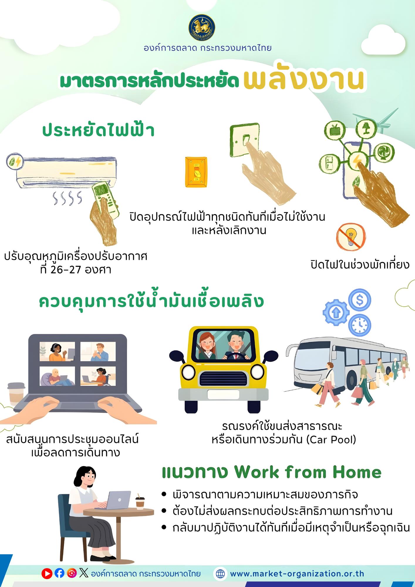 องค์การตลาด กำหนดมาตรการประหยัดพลังงาน โดยมุ่งเน้นการปรับเปลี่ยนพฤติกรรมการทำงาน และการใช้พลังงานอย่างคุ้มค่า เพื่อเป็นแบบอย่างที่ดีในการใช้พลังงานอย่างยั่งยืน